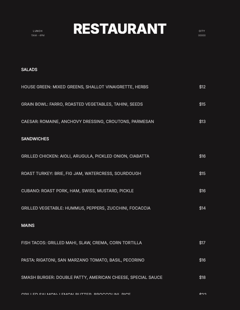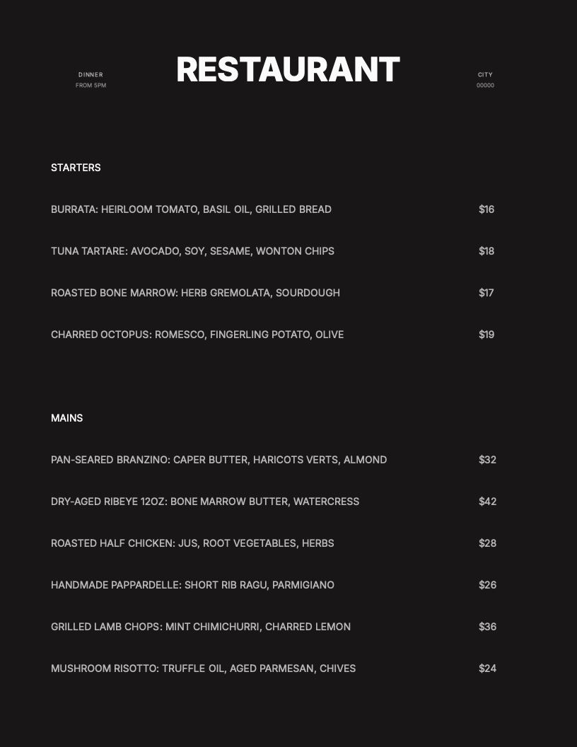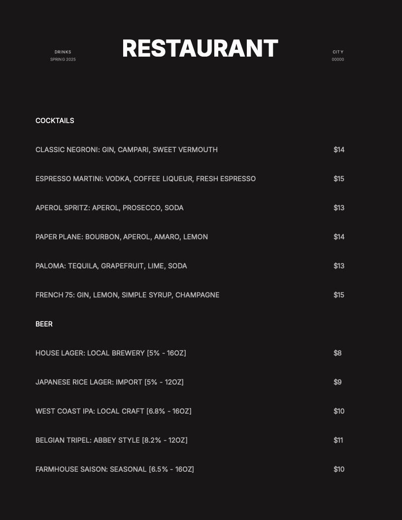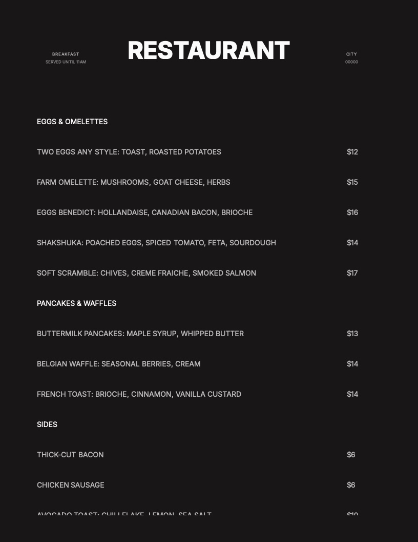 A complete restaurant menu system across four pages — breakfast, lunch, dinner, and drinks. Each page follows the same clean structure: a branded header with your restaurant name and location, and a single unified table where section headers and menu items flow naturally together. Dark theme with minimal styling puts the focus on the food. Swap in your own dishes, prices, and branding to make it yours.