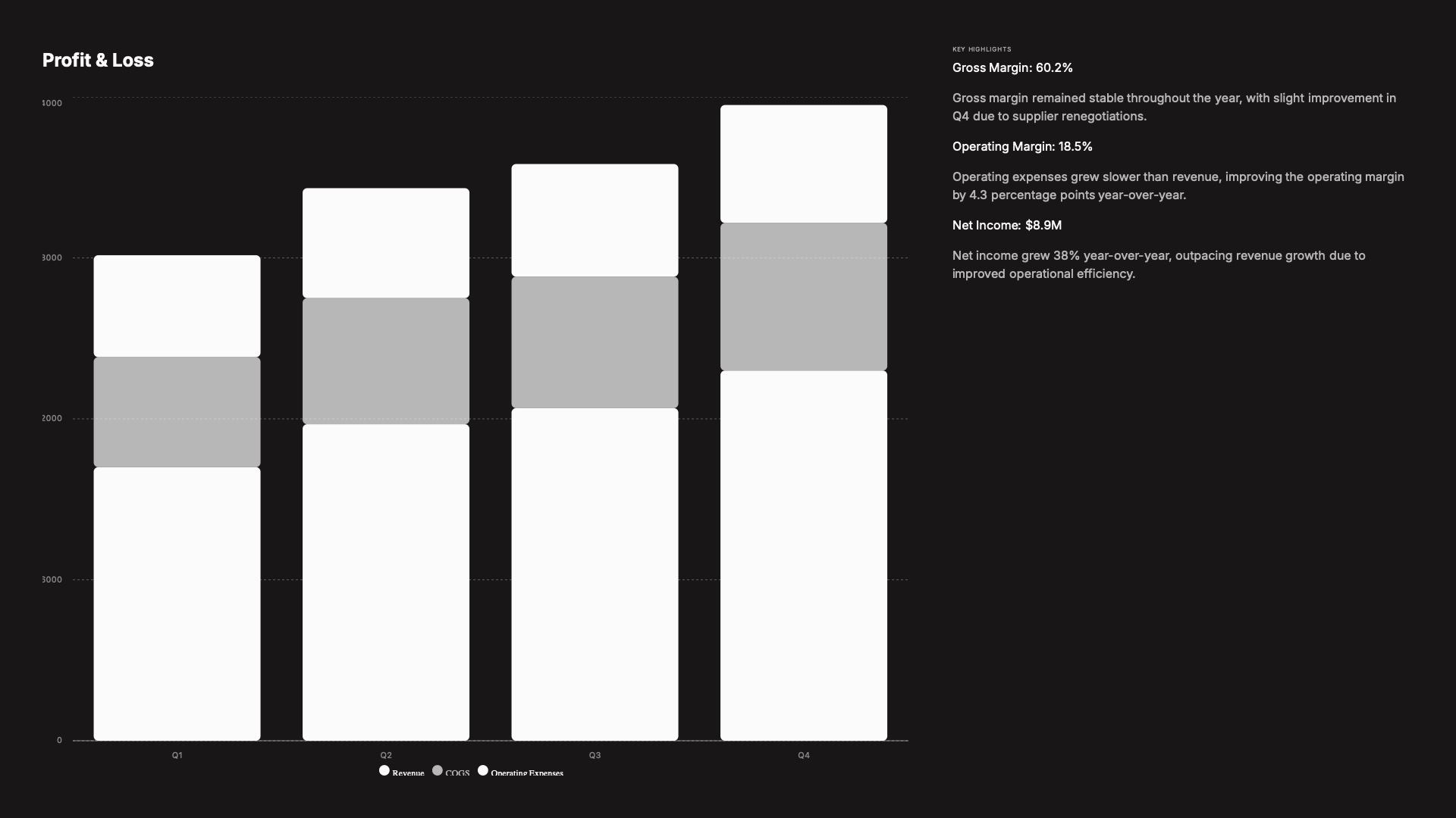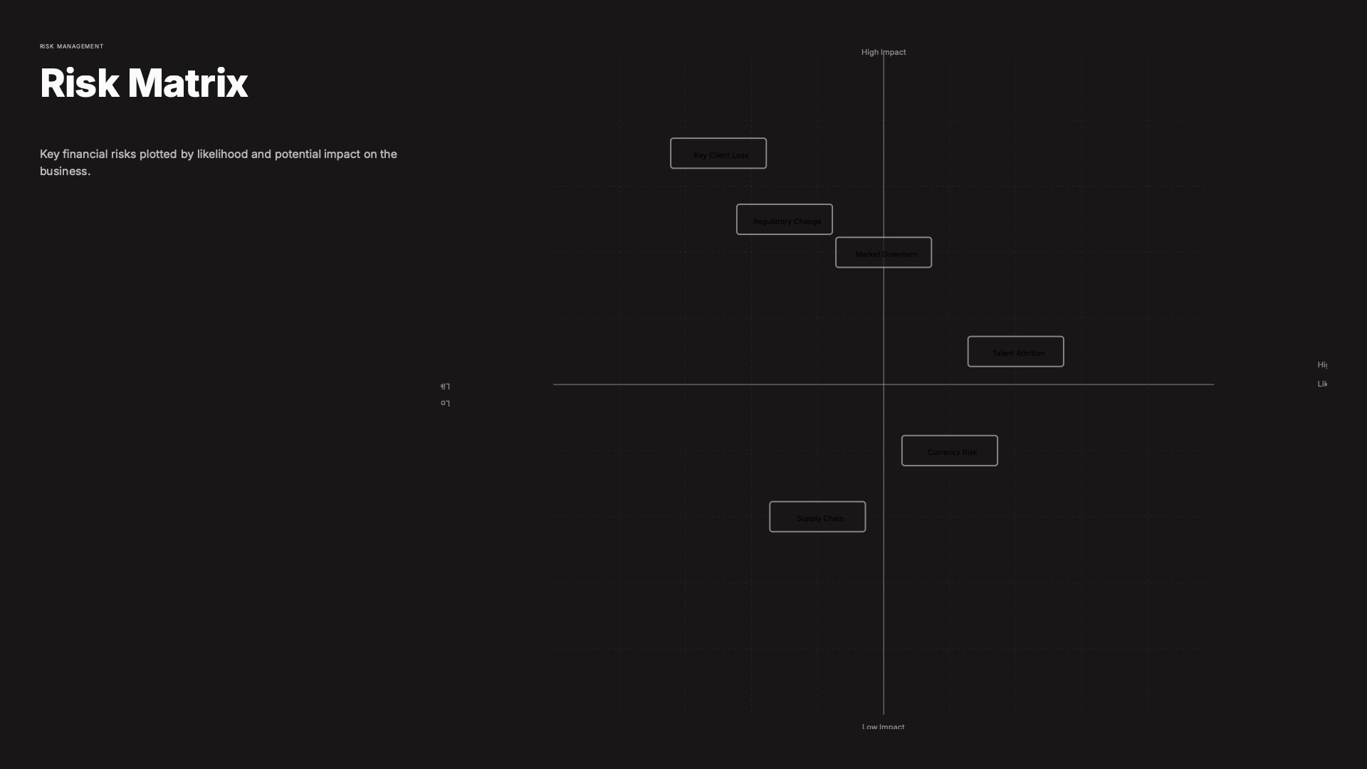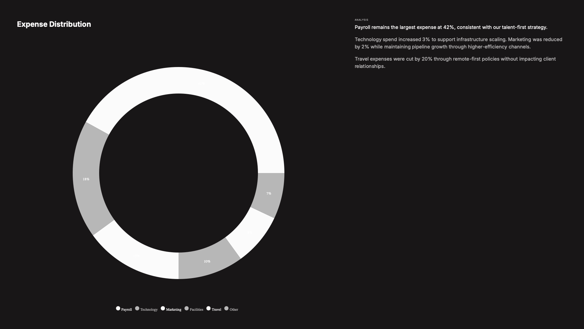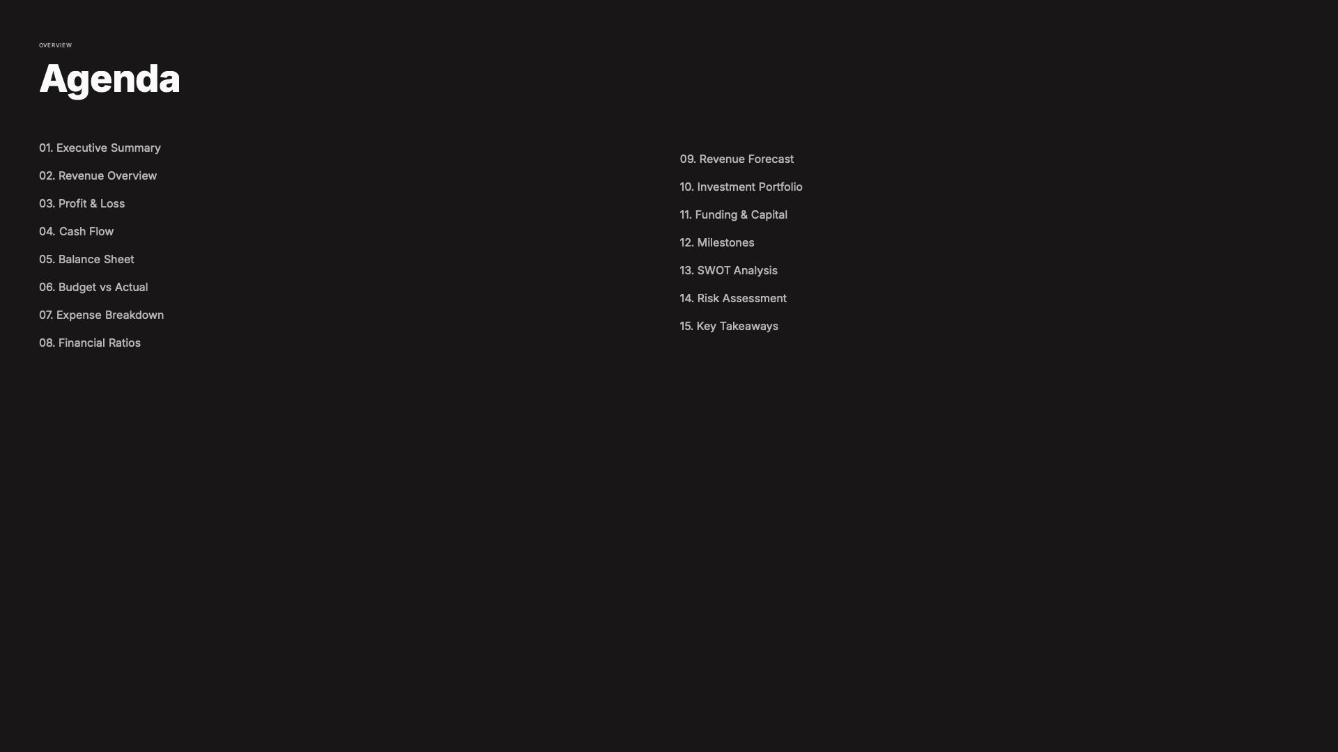 The Finance Master template is a complete financial presentation toolkit with 18 pages covering everything from executive summaries to detailed P&L breakdowns, cash flow analysis, and investment portfolios. Each page is built with purpose-specific visualizations — bar charts for revenue comparisons, area charts for cash flow trends, donut charts for expense breakdowns, and strategic frameworks like SWOT and risk matrices. Customize the data, adjust the narrative, and present financial insights that command attention.