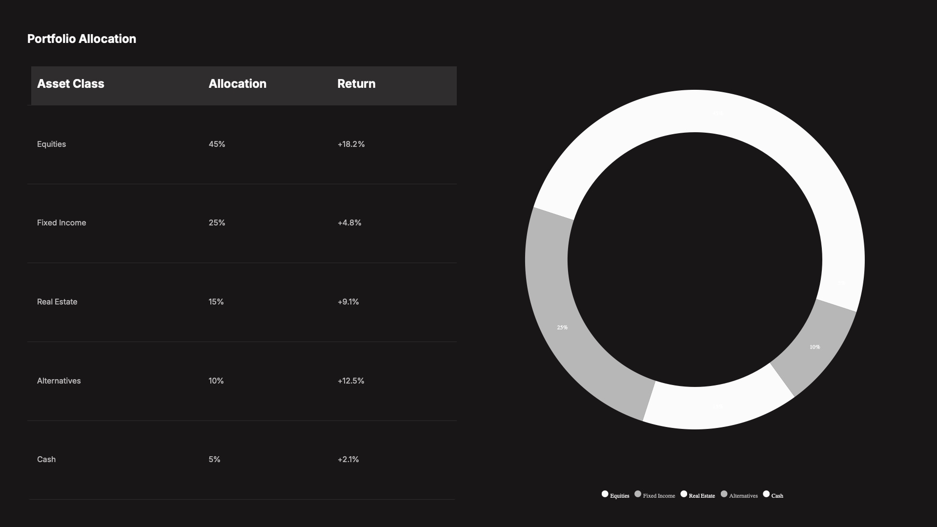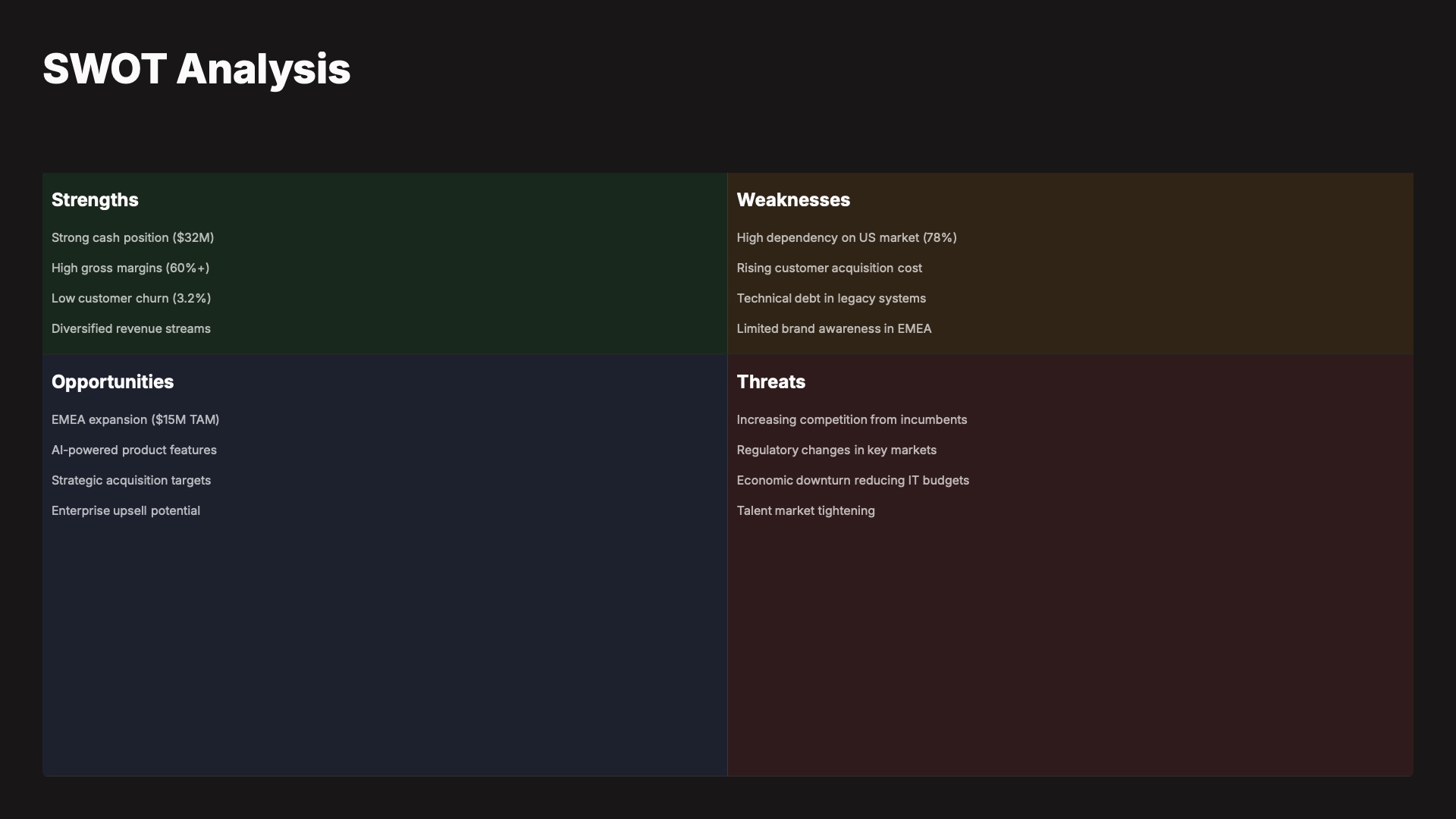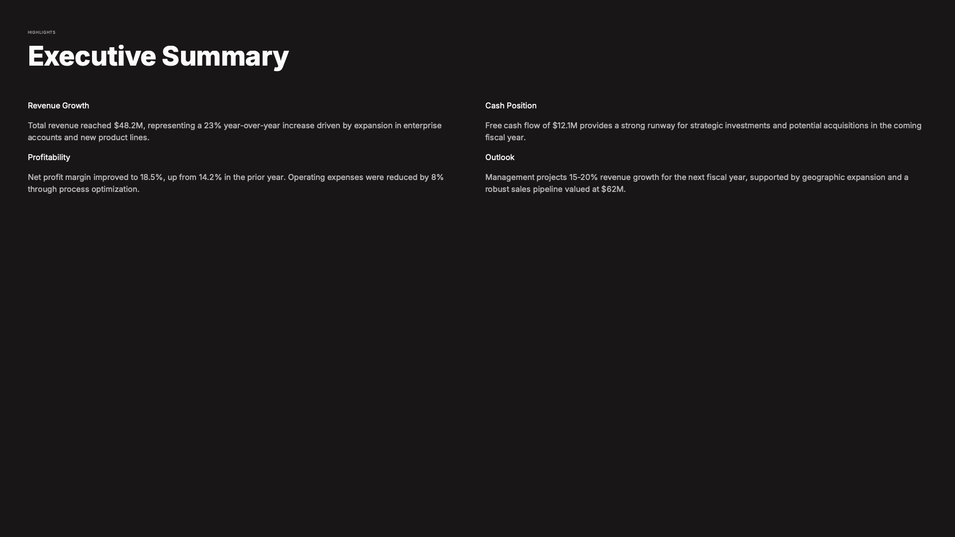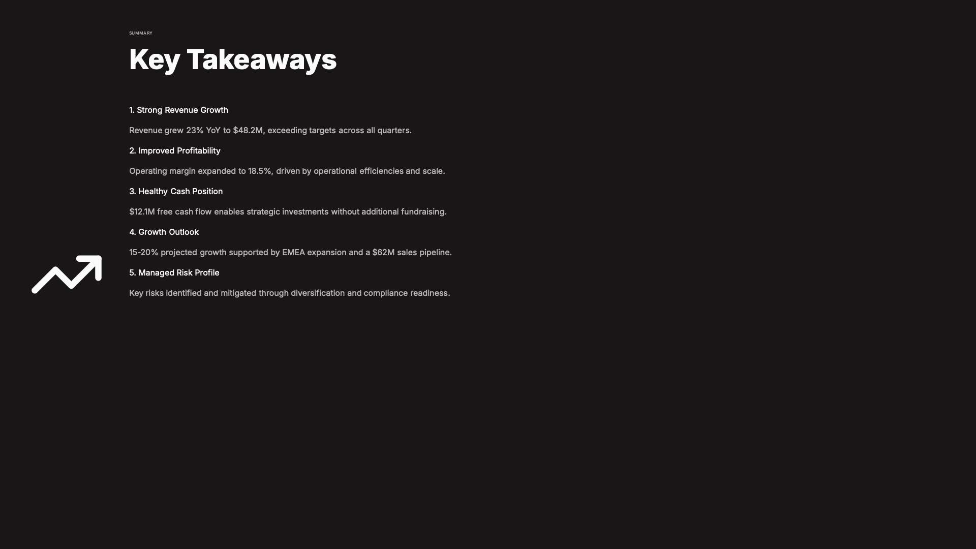 The Finance Master template is a complete financial presentation toolkit with 18 pages covering everything from executive summaries to detailed P&L breakdowns, cash flow analysis, and investment portfolios. Each page is built with purpose-specific visualizations — bar charts for revenue comparisons, area charts for cash flow trends, donut charts for expense breakdowns, and strategic frameworks like SWOT and risk matrices. Customize the data, adjust the narrative, and present financial insights that command attention.
