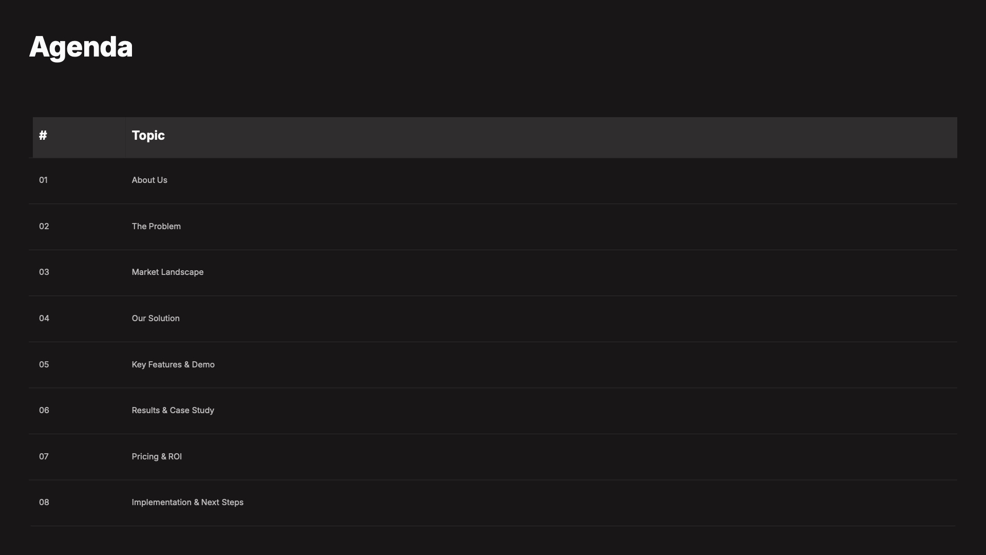The Sales Proposal Master template is a comprehensive 20-page presentation designed to guide your prospect from problem to purchase. Featuring competitive matrices, ROI charts, Gantt timelines, and data-driven case studies, every page is crafted to build a persuasive narrative. Customize the copy, swap in your brand colors, and present with confidence knowing the structure does the selling for you.